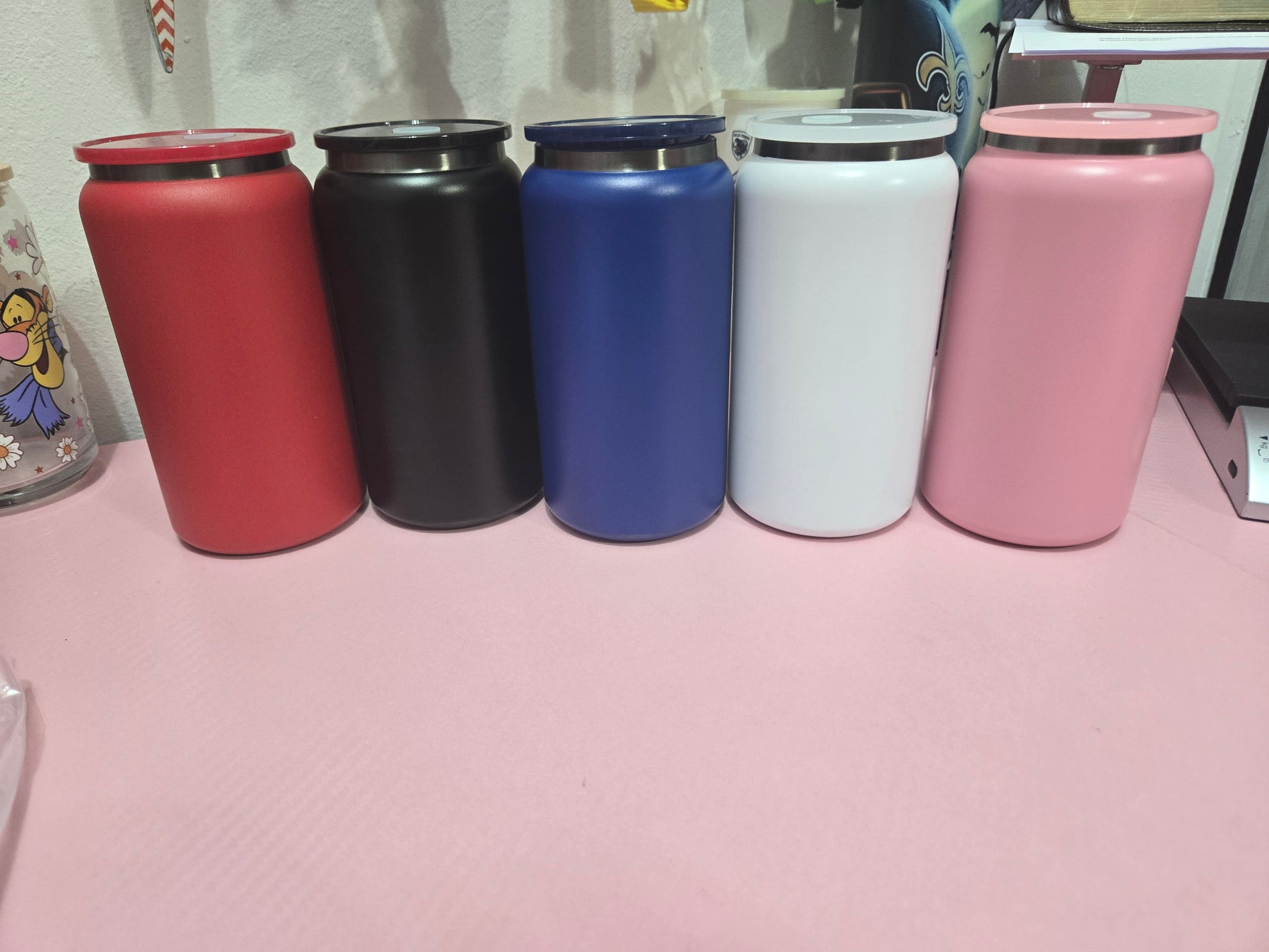 16oz stainless steel cans colored w/lid and colored straws